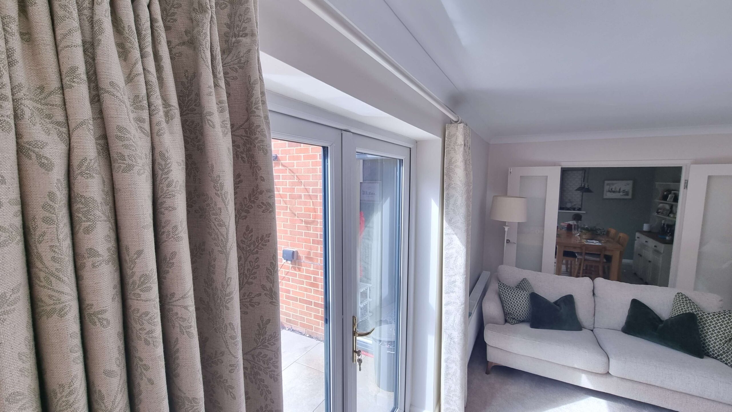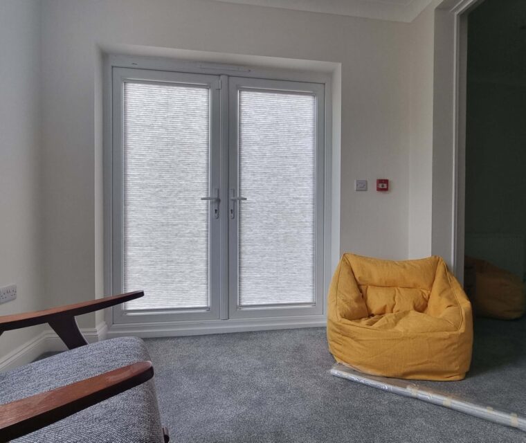 Following a recent renovation, these handmade double pinch pleat curtains were created to provide the perfect finishing touch to the room. Crafted from Sanderson Ferndown Sage fabric, they introduce a soft, nature-inspired palette and subtle pattern that enhances the overall interior scheme. The structured double pinch pleat heading creates elegant, even folds that drape beautifully, adding depth and a tailored appearance to the window. Paired with a contemporary 32mm metal curtain pole, the installation achieves a balanced blend of classic detailing and modern refinement. Made to measure for a precise fit, these bespoke curtains not only elevate the aesthetic of the space but also offer practical benefits such as light control and privacy, resulting in a cohesive and inviting interior. Door-mounted honeycomb blinds were selected to maximise flexibility and light control, offering excellent insulation and a streamlined appearance while remaining practical for daily use. Combined with child-safe operating systems and durable materials suitable for high-traffic areas, the installation provides a secure and versatile solution tailored specifically for commercial and educational environments. Delivered within a fast turnaround schedule, the project demonstrates our ability to combine efficiency, safety, and high-quality workmanship in demanding contract settings.
